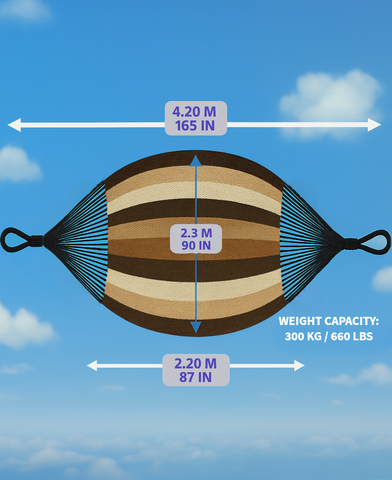 - The Catalina hammock is a handcrafted piece that combines the warmth of ecru, brown, and black tones. Its timeless and sophisticated design invites relaxation, offering a haven of comfort and style.